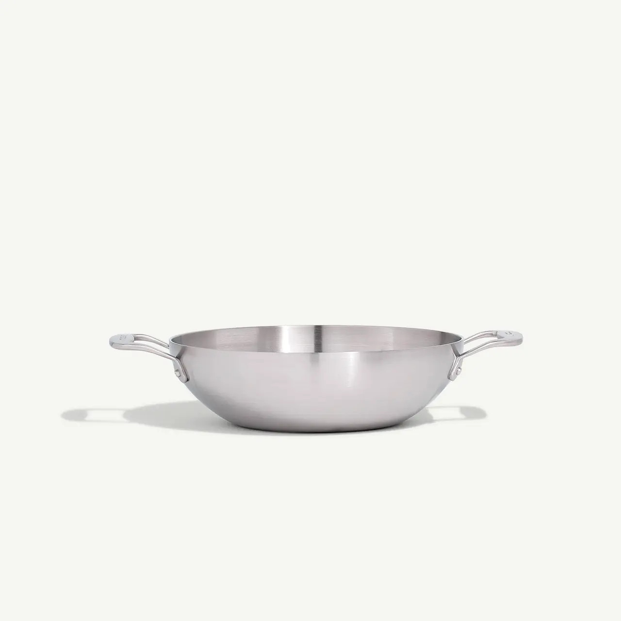 A Kadai is a deep, circular and flat-bottomed pan with sloped sides that is typically used in Indian and South Asian cooking. It is suitable for slow cooking, deep-frying, and simmering. Made In’s kadai features five layers of metal so that it heats evenly all the way up the sides and across the base - giving you control whether deep-frying samosas or building a delicious dal. The ergonomic handles offer a comfortable grip as you cook and serve.
