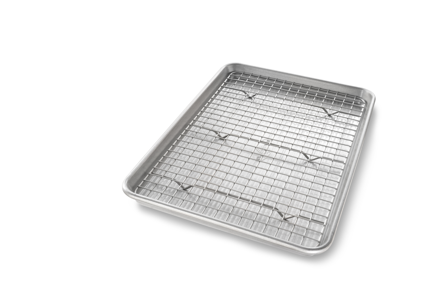 USA Pan has finally paired its new grid racks with its existing aluminized steel, silicone-coated sheet pans, just in time for the holidays. Perfect for making bacon and buffalo wings in the oven, the grid rack fits right inside the sheet pan to make crispy edges possible by draining away the fat. Use the pan alone for roasting vegetables and baking cookies, or for a prep tray for your "mise en place". The grid racks can be used alone to cool your baked goods once they are removed from the oven. So many combinations, so many possibilities!