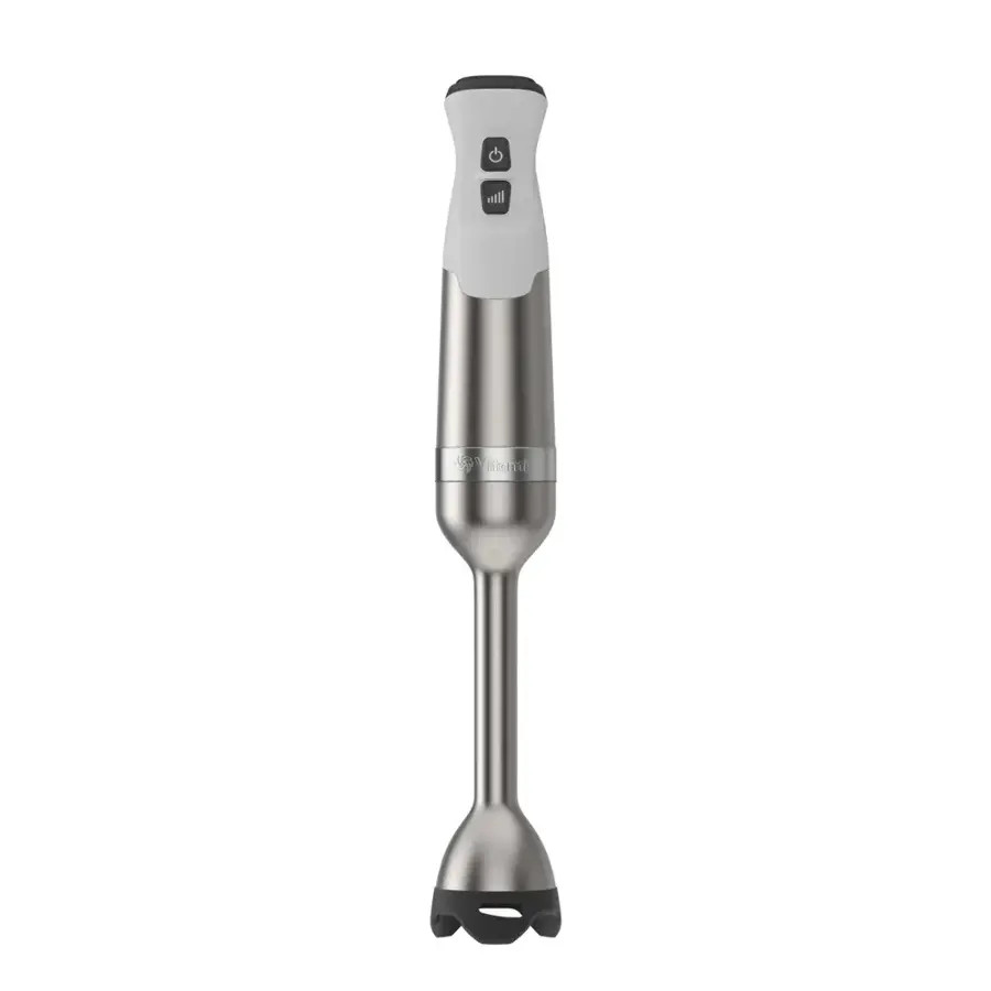 This first immersion blender from Vitamix has precision design and powerful performance you can trust. With a 625-watt motor and 5 speeds, you can create ideal textures from whole-foods like greens and frozen fruit, while blending in your favorite container. The blender is easily operated with one hand, allowing you to add ingredients with the other. And the specially designed bell guard reduces suction, allowing ingredients to flow easily through the blades, protecting your pots, pans and containers from scratches. You can blend in an container with a 3-inch wide (or larger) opening, such as a smoothie cup or a 1-quart wide-mouth Mason jar.